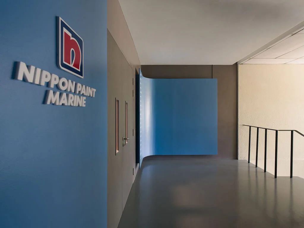 On the west side of Singapore, the Nippon Paint Marine office draws inspiration from the poetics of ships and the artistry of color. A sculpted blue portal defines the entrance — its gentle curve recalling the hull of a vessel, a gesture both symbolic and spatial. Horizontal markings extend this narrative, reinterpreting hull lines as part of the company’s identity and maritime heritage.