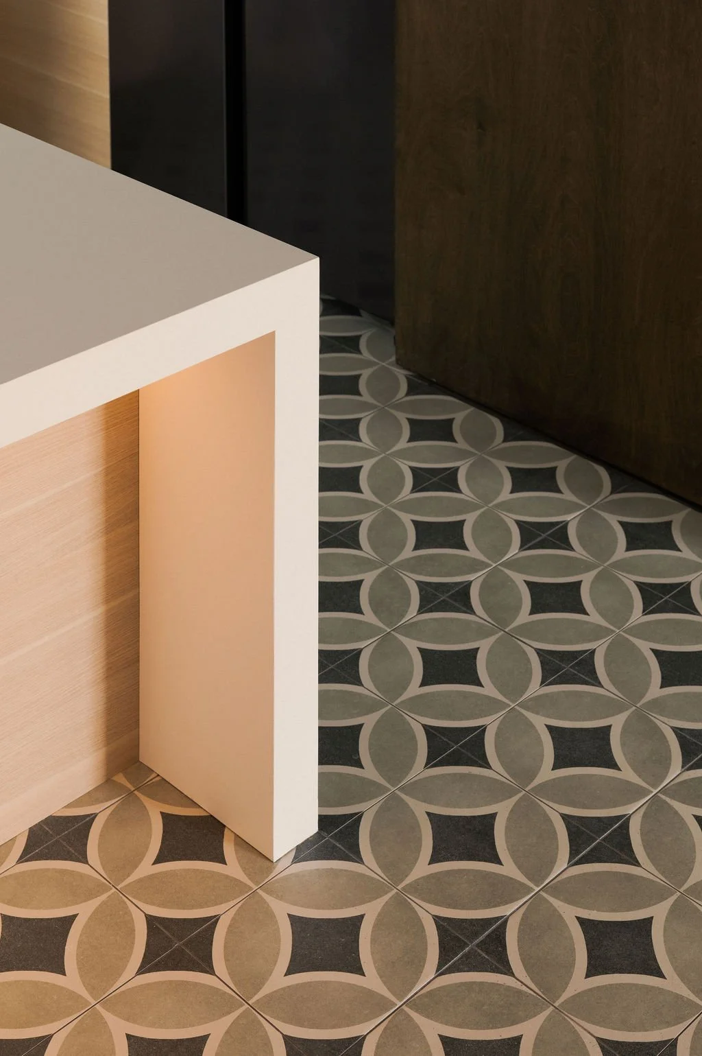 Inspired by nature, the material palette features a wall of linear rift-cut wood patterns that flows organically from the front to the rear of the space, culminating in two cozy waxing pod stations, each accented with illuminated ginkgo-patterned oculi. A niche, housing an ikebana composition, catches the eye of clients as they rise from the bed. Integrated into the interior architecture, these wooden panels are hidden storages for essential operational utilities. The raised platform, which supports the pedicure and manicure stations, includes built-in drainage is finished with homogenous tiles and pebble wash, enhancing the soothing, organic atmosphere.