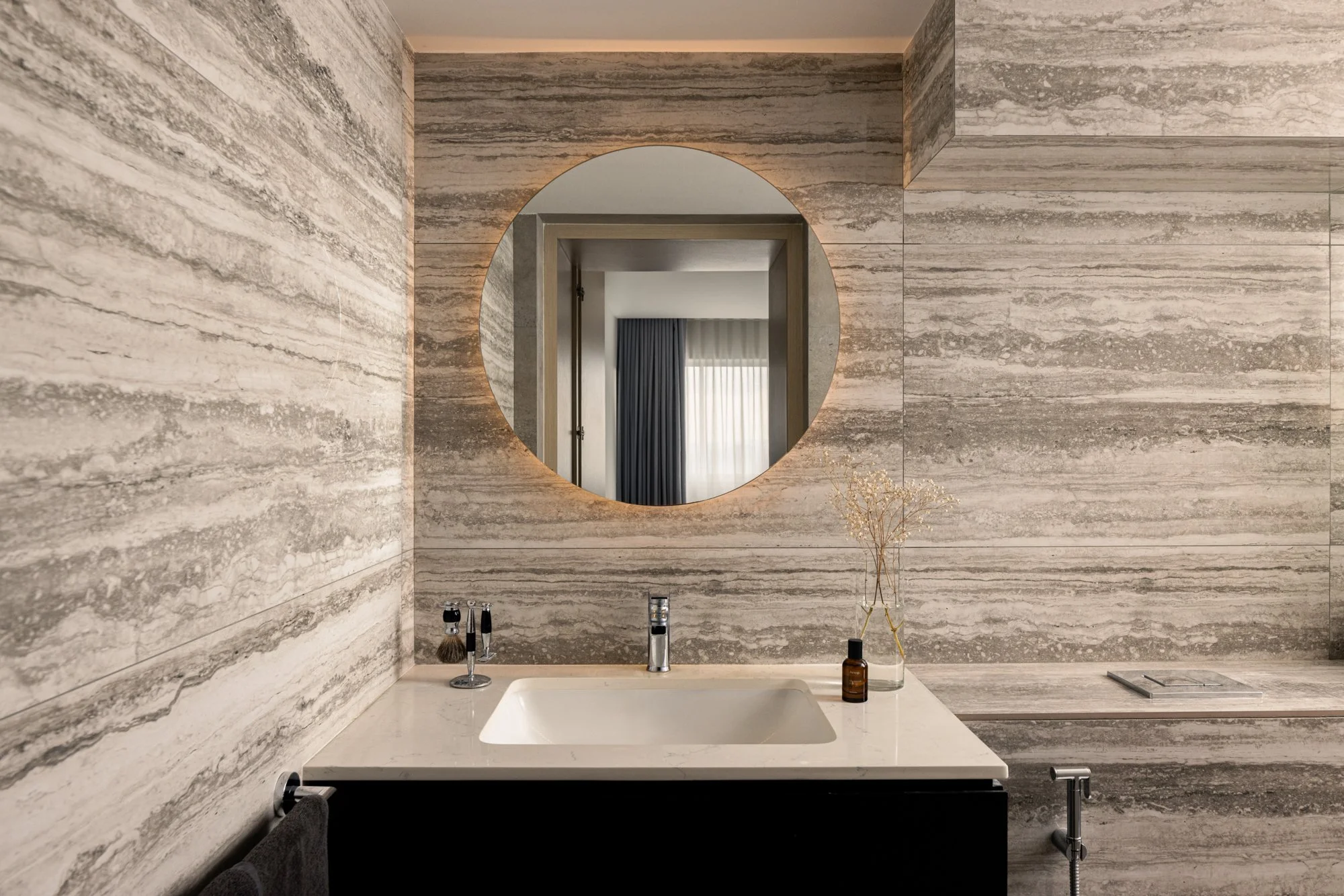 Designed for a worldly couple with a deep appreciation for art and culture, it is conceived as an urban sanctuary of calm and permanence. A restrained palette of marble, timber, and textured fabrics balances coolness and warmth, light and shadow.